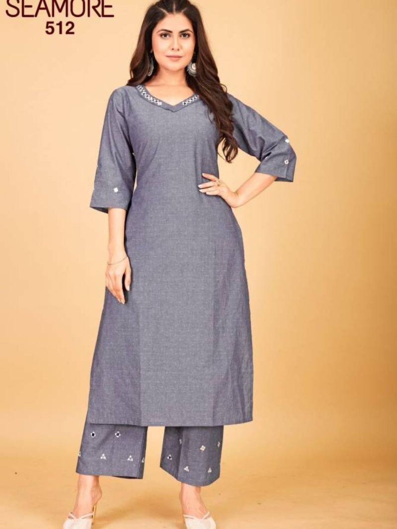 Seamore Gangotri Mirror Work Denim Cotton Kurta With Palazzo At Wholesale Price