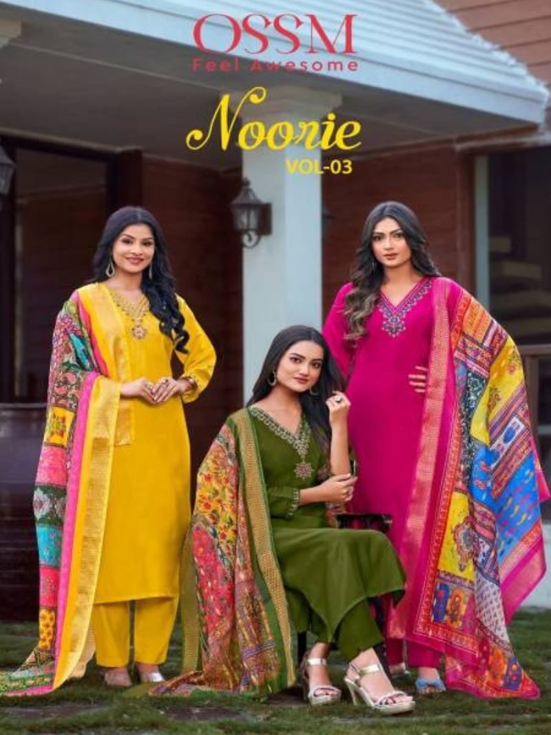 Ossm Noorie Vol 03 Embroidery Designer Roman Silk Ladies Kurtis With Bottom Dupatta Wholesale Catalog