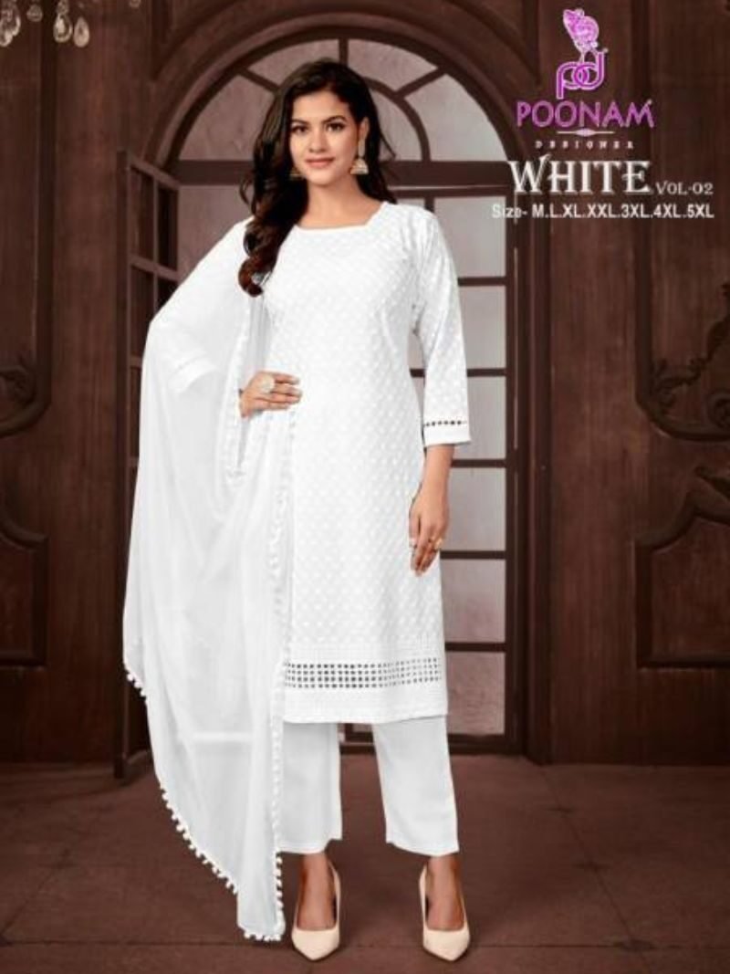 Poonam White Vol 2 White Rayon Wholesale Kurti With Bottom Dupatta Catalog
