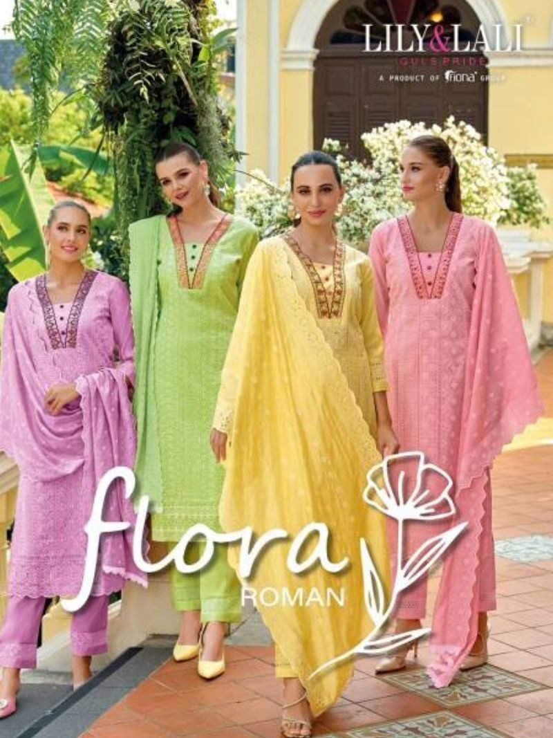 Lily And Lali Flora Roman Schiffli Embroidery Designer Wholesale Kurtis With Bottom Dupatta Catalog