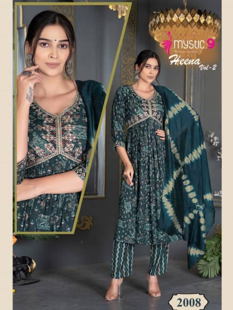 Mystic 9 Heena Vol 2 Fancy Printed Embroidery Wholesale Kurti With Bottom Dupatta Catalog