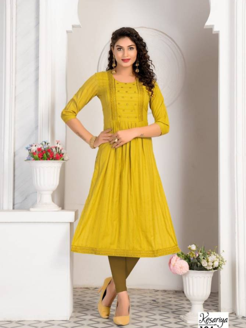 Hirwa Kesariya Fancy Naira Cut Designer Rayon Ladies Kurtis Wholesale Catalog