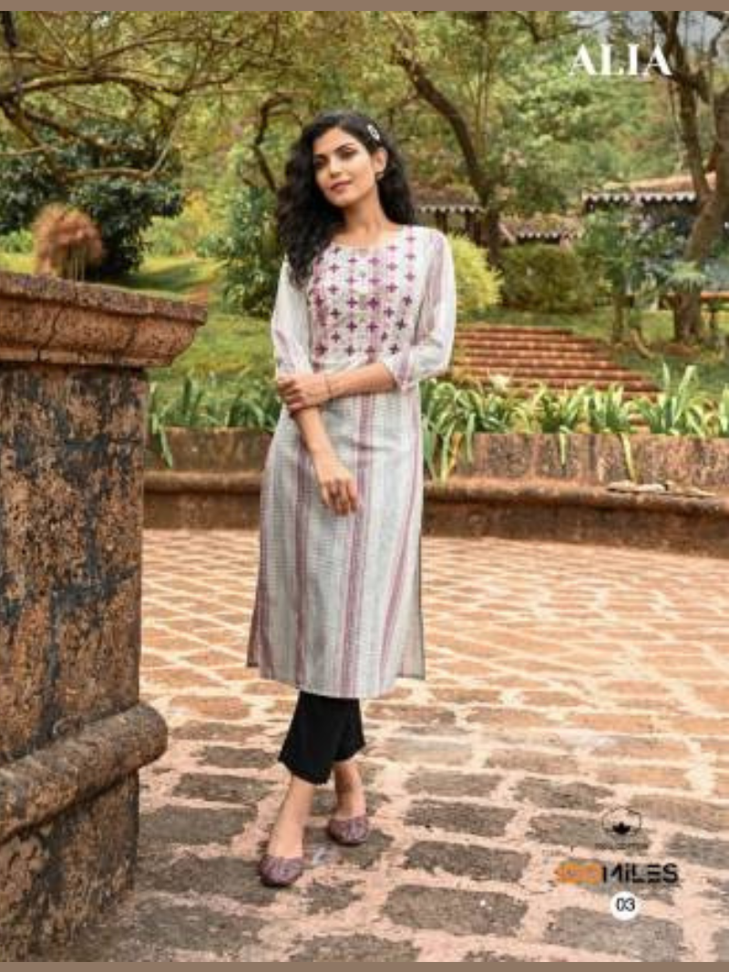 100 Miles Alia Embroidery Designer Cotton Kurtis Wholesale Catalog
