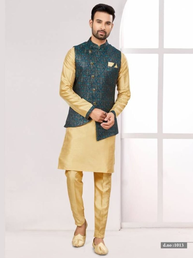 Traditional Wear Art Embroidered Banarasi Silk Mens Modi Jacket Kurta Pajama Wholesale Catalog