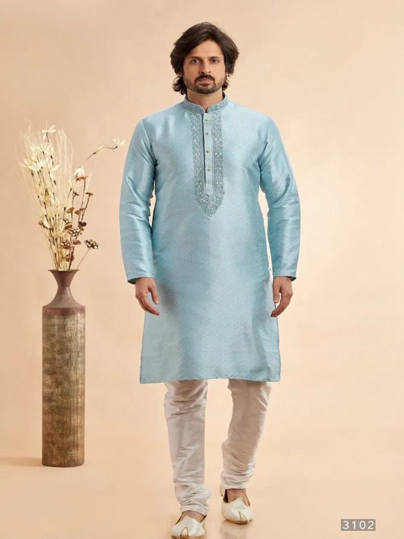 Vol 94 Occasion Wear Jaquard Designer Art Silk Mens Kurta Pyjama Wholesaler
