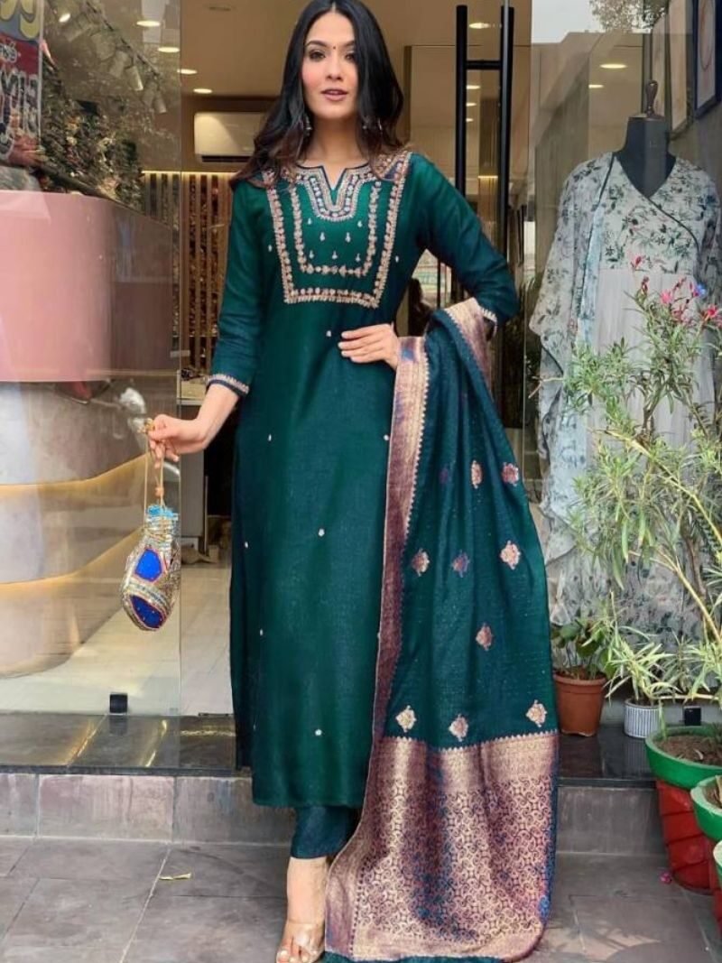 Dark Green Colour Silk Readymade Suits With Bottom and Dupatta At Wholesale Price