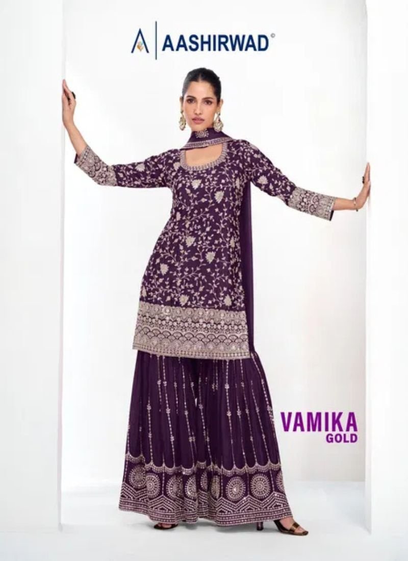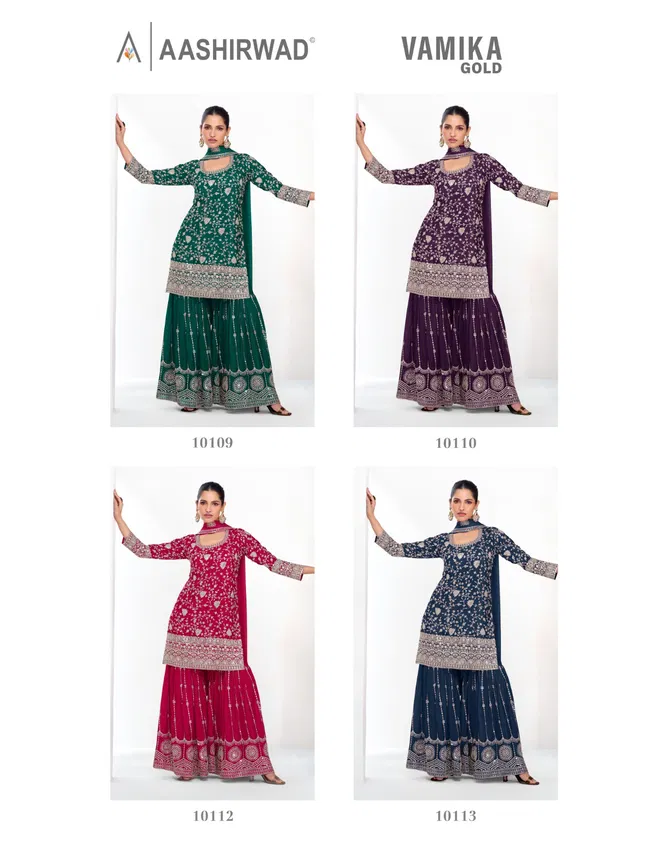 Aashirwad Vamika Gold Chinnon Designer Readymade Suits Wholesale Catalog
