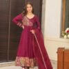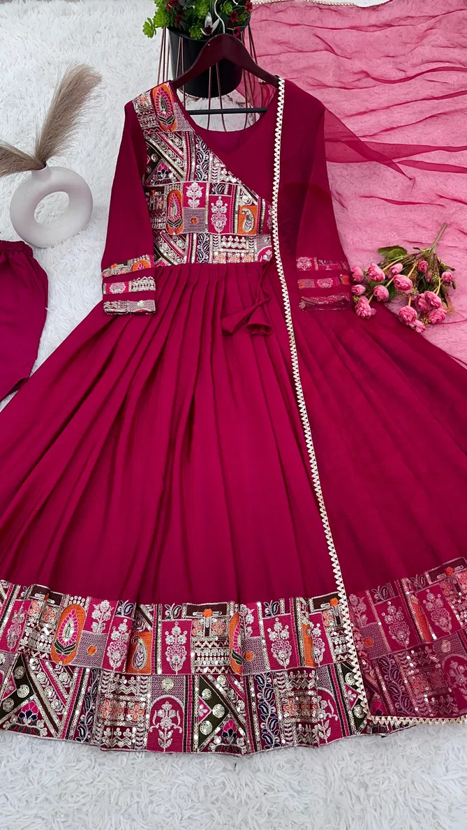 Gown Fabric : Pure Heavy Chinnon Silk With Full Heavy Embroidery Sequence Work With Sleeve | Gown Inner : Micro Cotton | Gown Length : 51-52 Inches | Gown Flair : 3 Meter | Bottom Fabric : Micro Cotton Fullstitched Free Size | Dupatta Fabric : Heavy Net With Lace Border
