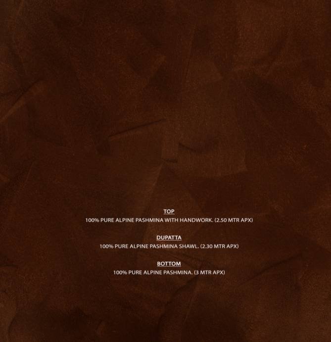 FabricTop: 100% PURE WINTER ALPINE WOOL with HandWork (2.50 mtrs apx) | Dupatta: 100% PURE WINTER ALPINE WOOL SHAWL (2.30 mtrs apx) | Bottom: 100% PURE WINTER ALPINE WOOL SALWAR (3 mtrs apx)
