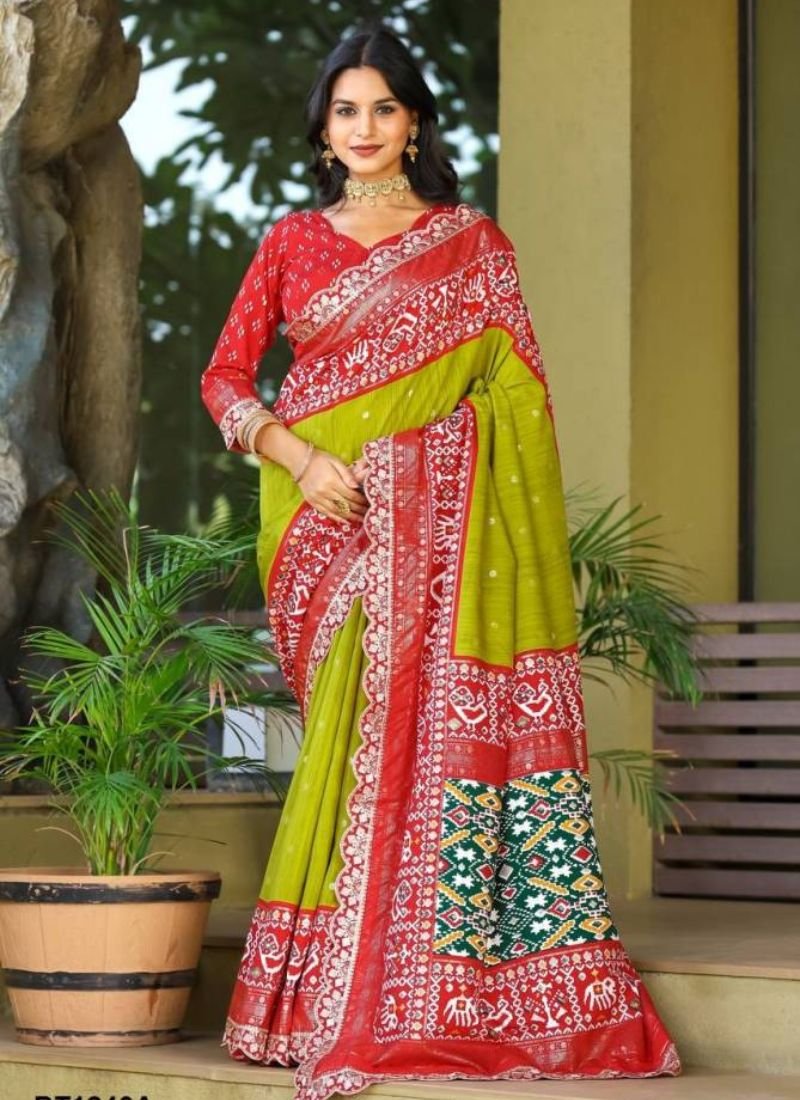 Saree Rich Ikkat Pallu As Shown Scalped Embroidery & Sequence Lace Border Attached on Saree Teamed | Blouse All Over Foil Butties Blouse Piece Having Sequin Lace Border | (Single Available – 100 Rs. Per Pcs Extra for Singles)