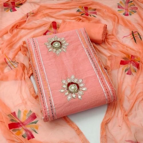FabricChanderi Cotton Fabric Description Top : Chanderi (2.20 Mtr) | Bottom : Santoon (2 Mtr) | Inner : Santoon (1.60 Mtr) | Dupatta : Najmin With Saburi Print (2.20 Mtr)