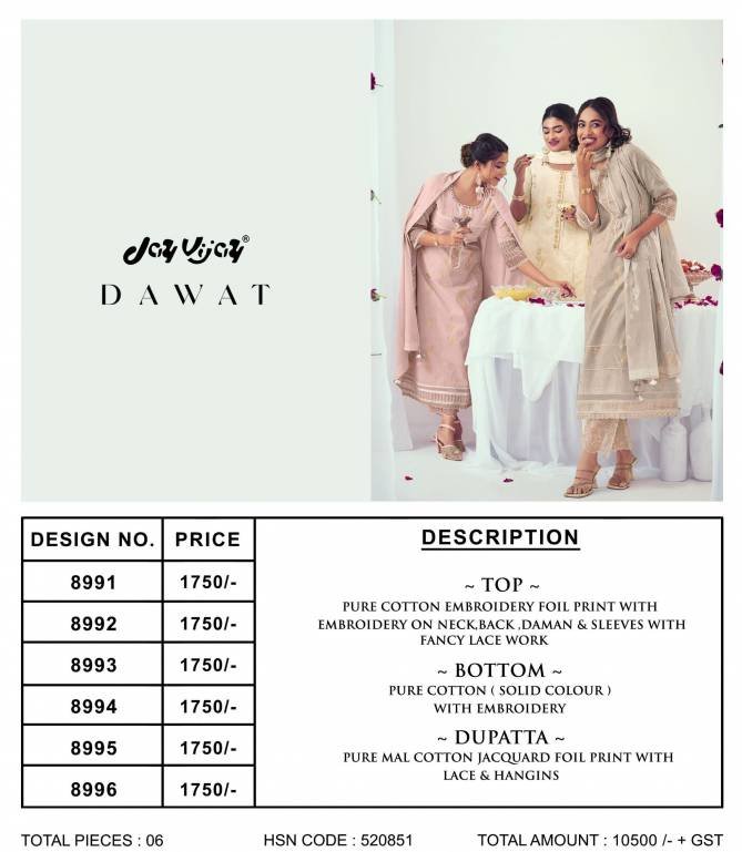Jay Vijay Dawat Summer Special Pure Cotton Salwar Suits Wholesale Catalog