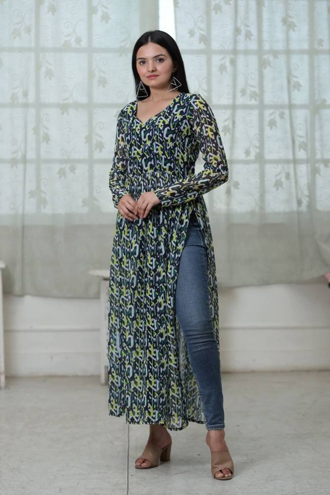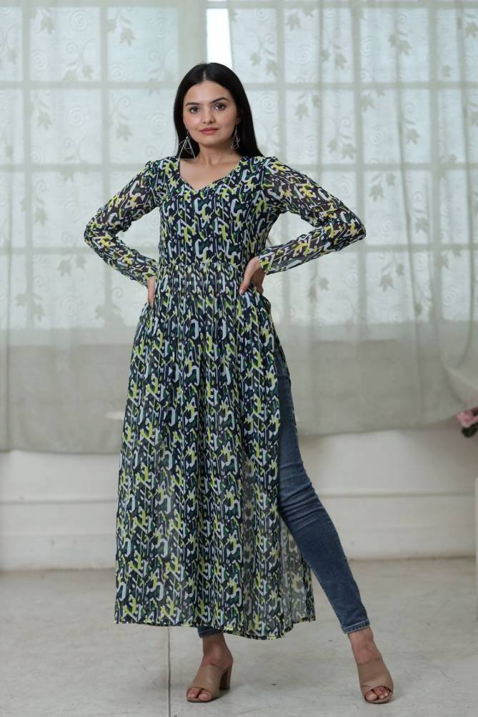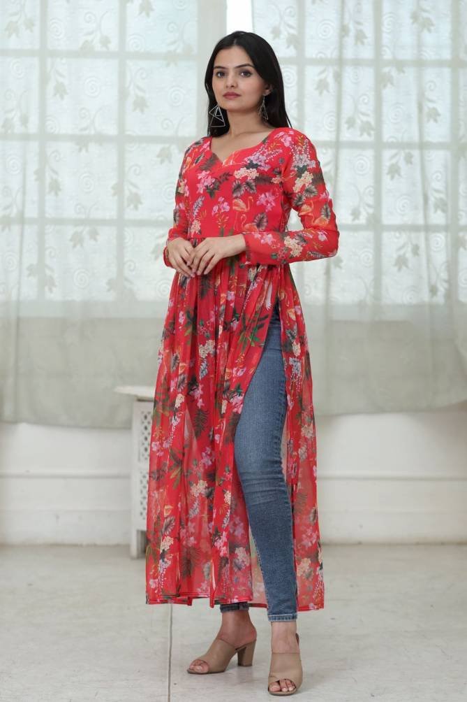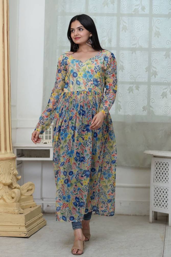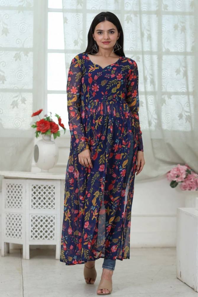Fox Georgette with Floral Digital print | LENGTH :- 50 INCH | LINING :- Cotton (Half Inner Top only) | SLEEVES :- Full sleeves (24”) (Single Available – 50 Rs. Per Pcs Extra for Singles)