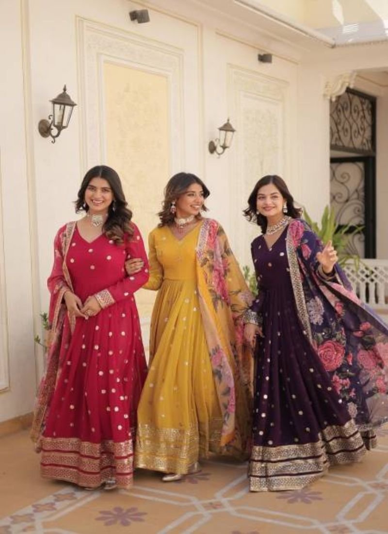 FabricFABRIC & WORK:- Faux Georgette with Embroidery Zari Sequins-work ?? SIZE:- M(38”),L(40”),XL(42”),XXL(44”) LENGTH:- 56 INCH | FLAIR:- 3.5 MTR | LINING:- Cotton (Full Inner Top To Bottom) | SLEEVE:- Full Sleeves | NECK TYPE:- V Neck | DUPATTA FABRIC :- Tabby silk, Embroidered work with designer lace border | Length:- 2.25MTR (Single Available – 100 Rs. Per Pcs Extra for Singles)