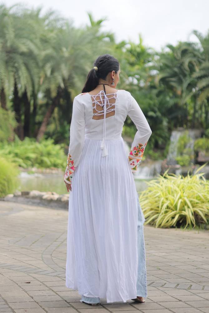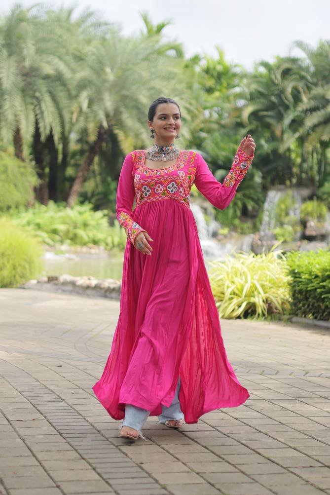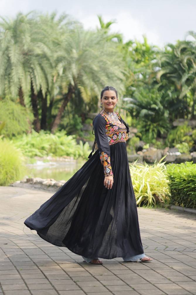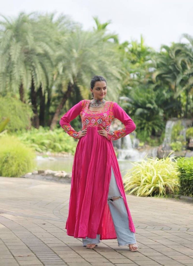 14 Kg Rayon With Kutchi Gamthi Work | Size :- L Size (40 Inch Stitched) {User can adjust From 38″ to 44″ for your body comfort)} Stitching :- Standard Stitch With Printed Flair | Length :- 52 Inch | Neck :- Fancy Neck as Shown in Image | Lining (Inner) :- Cotton (full up to bottom)