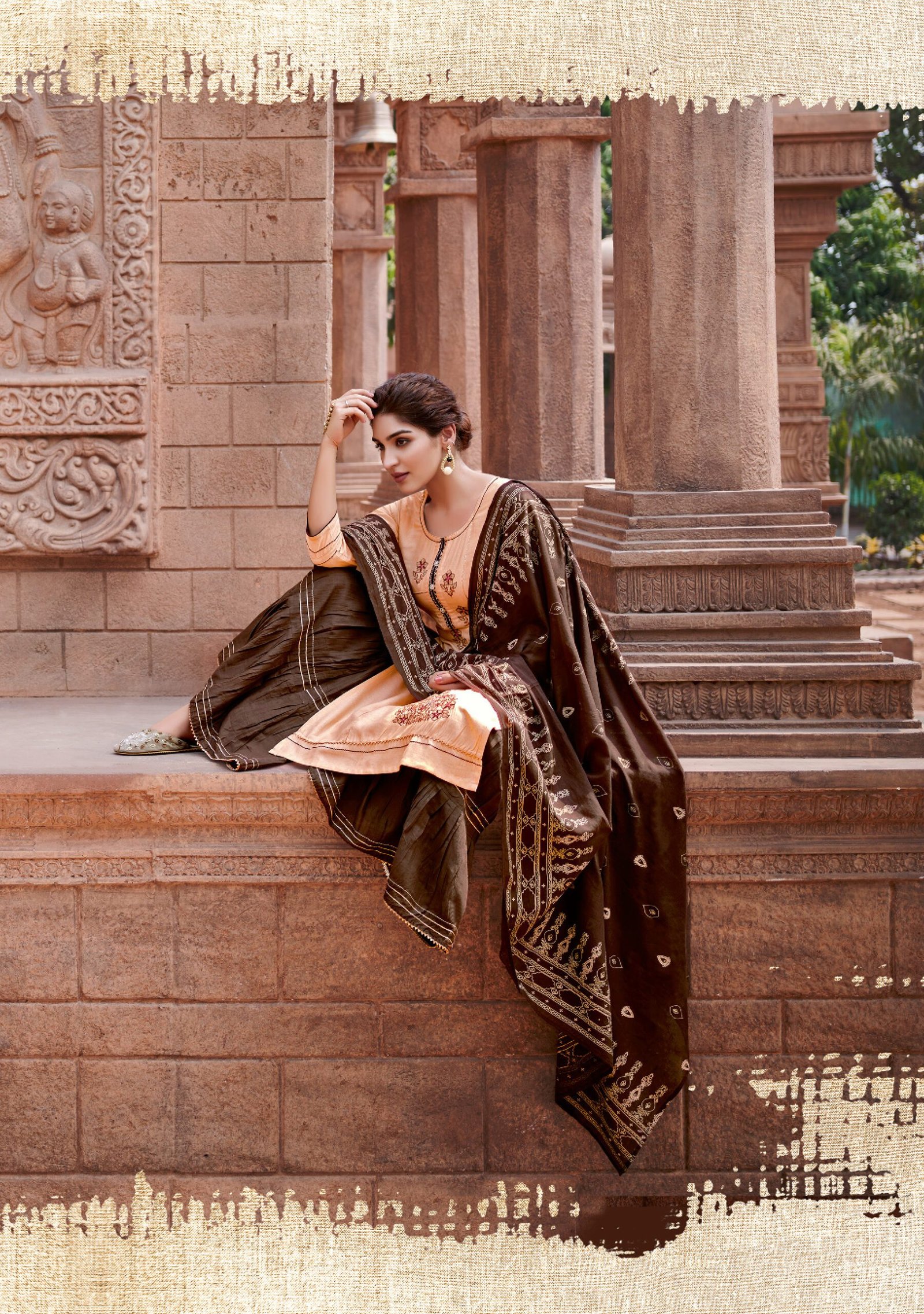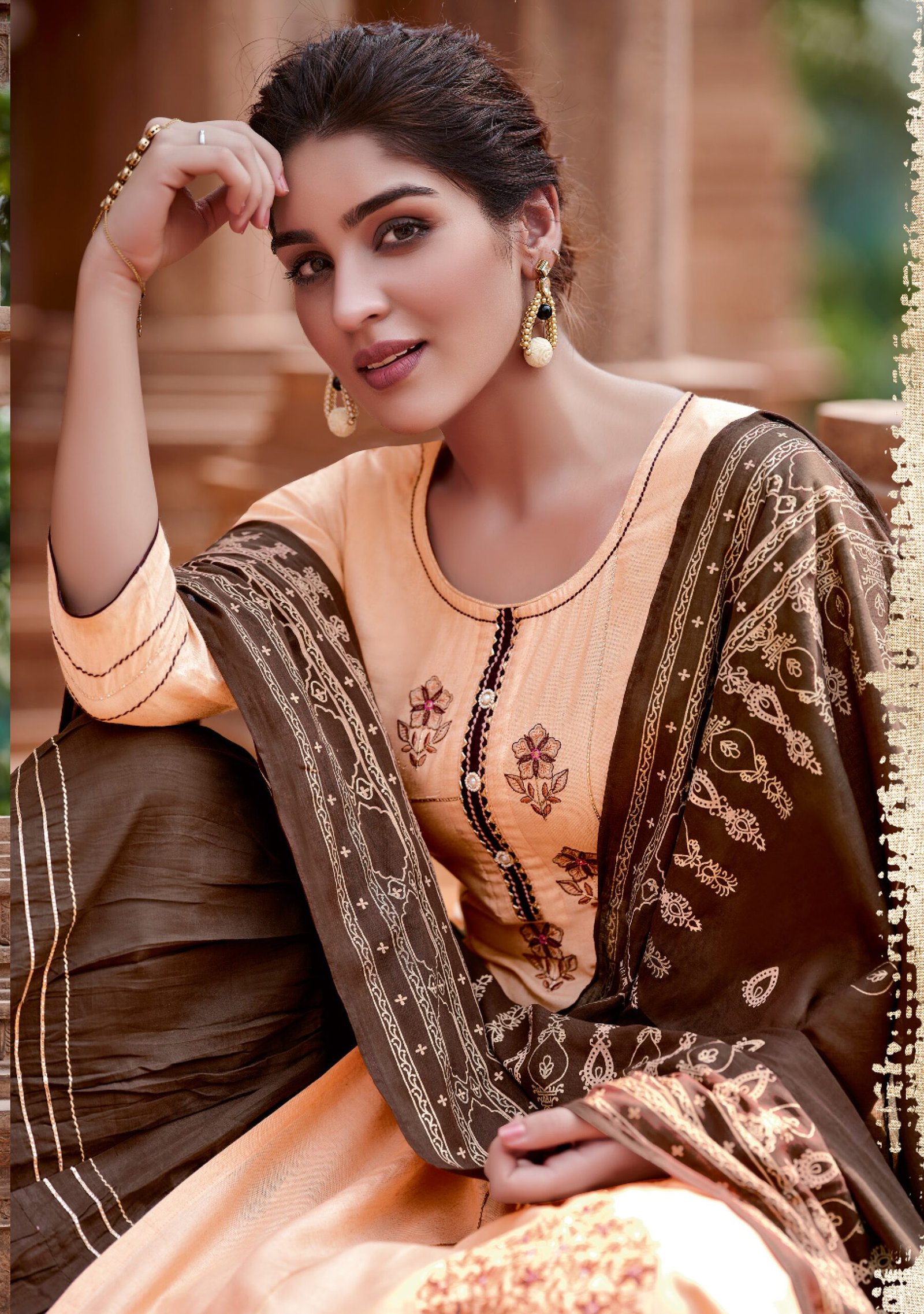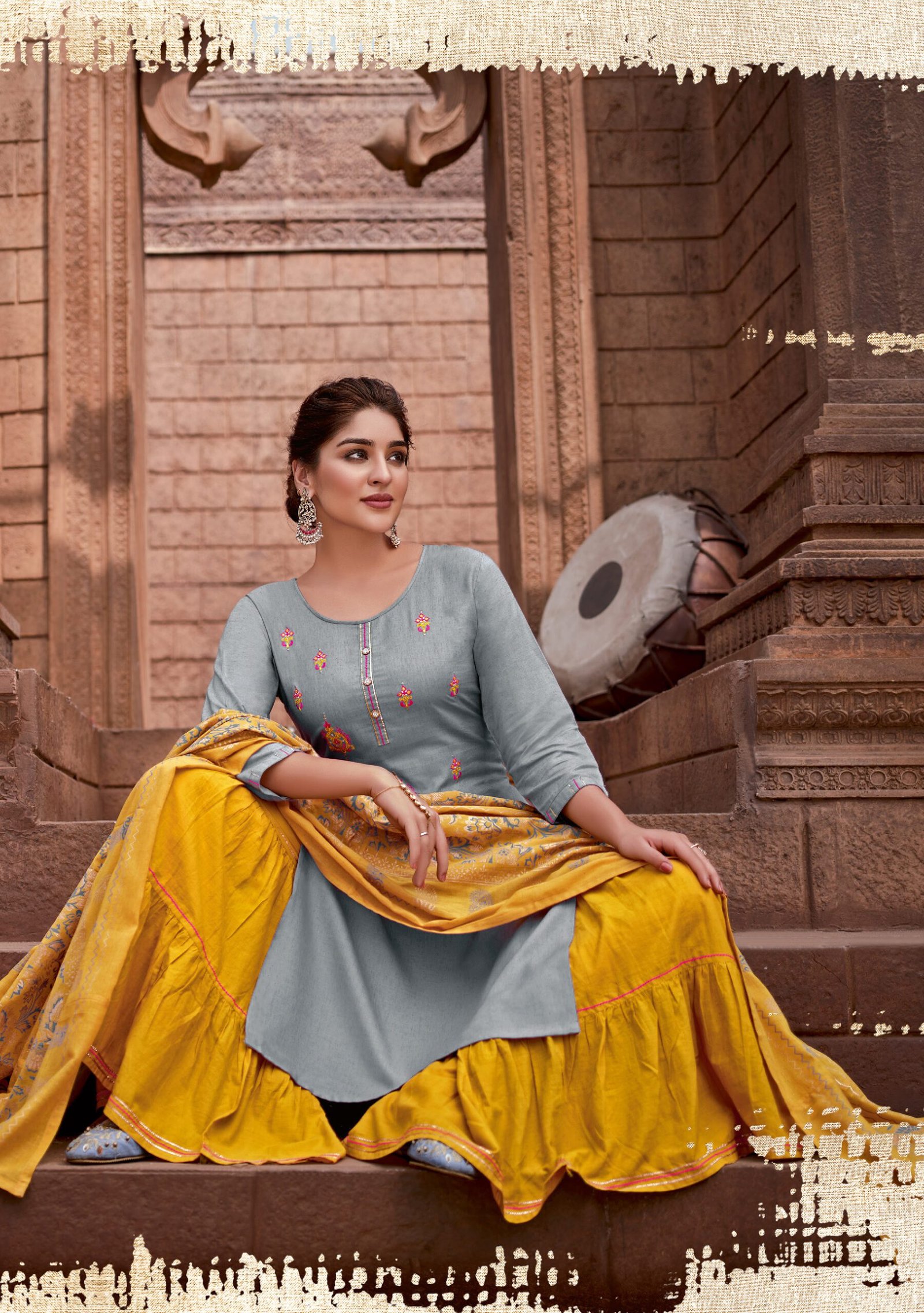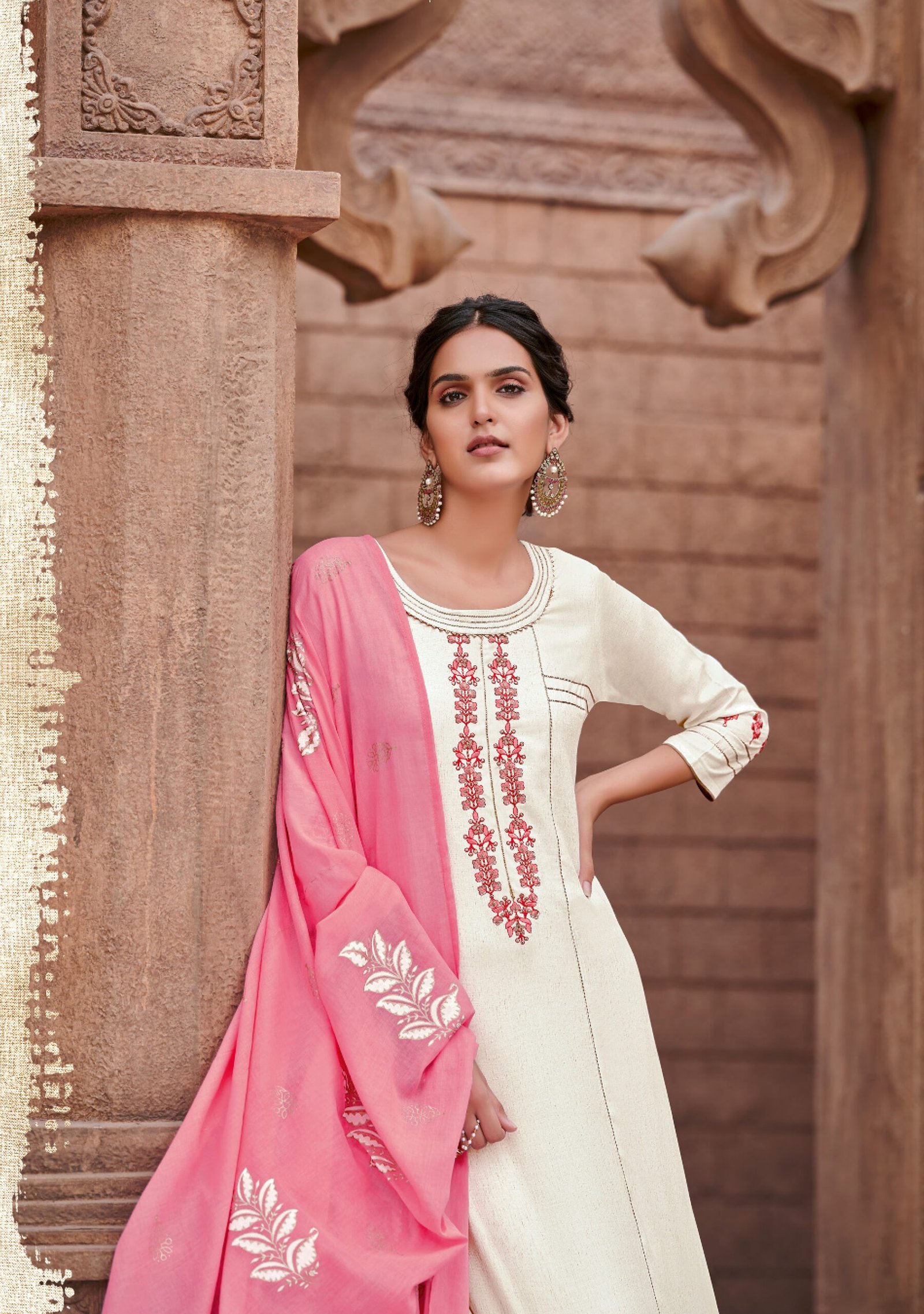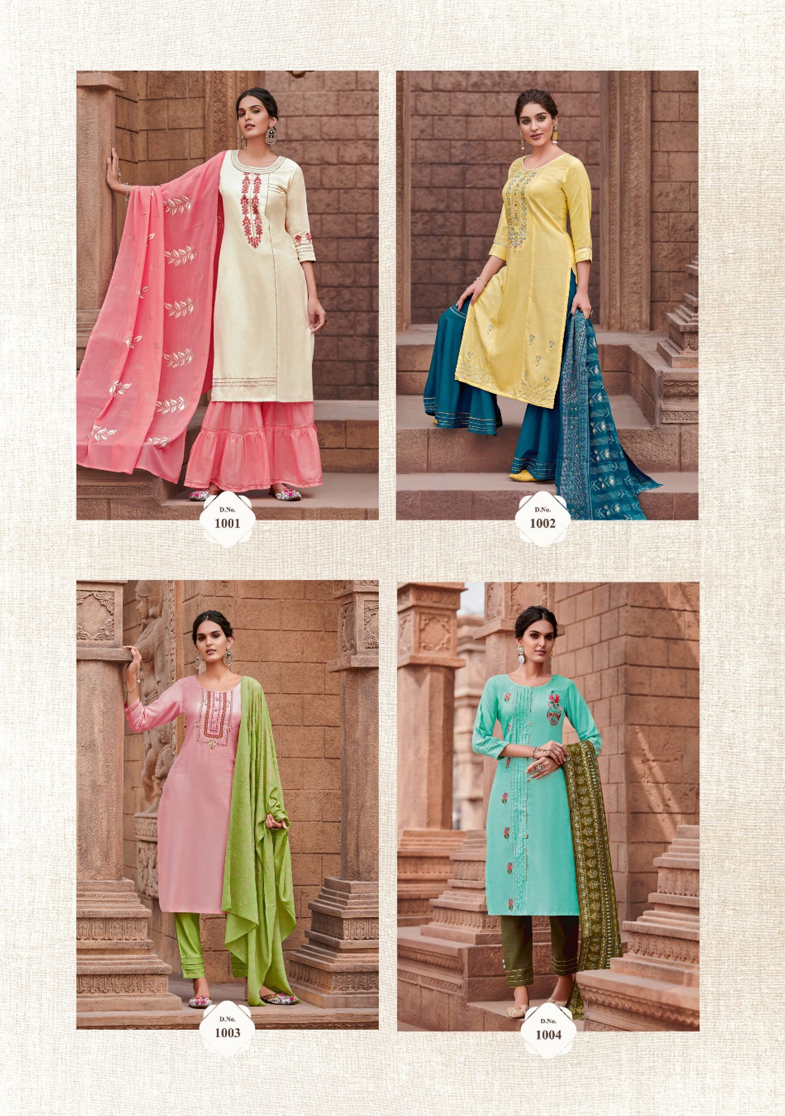 TOP : Viscos lilan Embroidery work, Sequence work, cotton less work, Handwork, Bottom : Maslin, sharara or pent, less patti work, Dupatta : Mal Mal fabric, Digital print