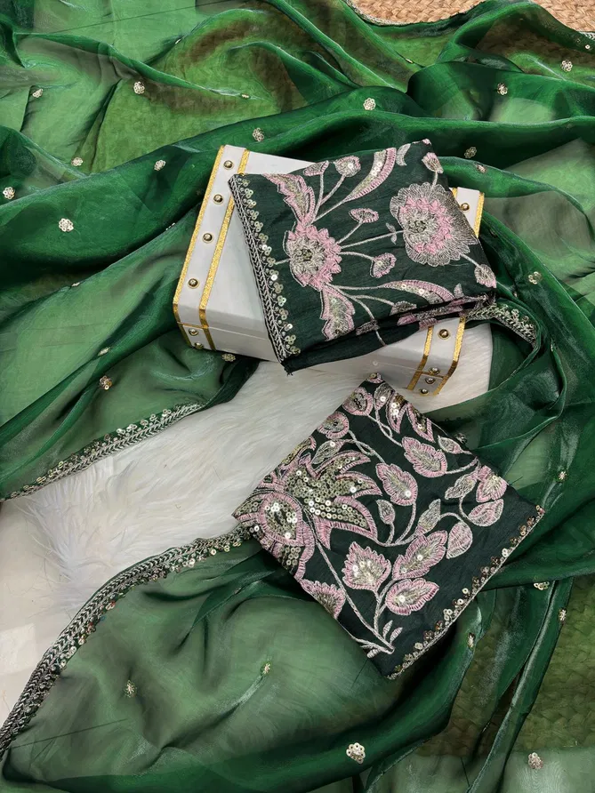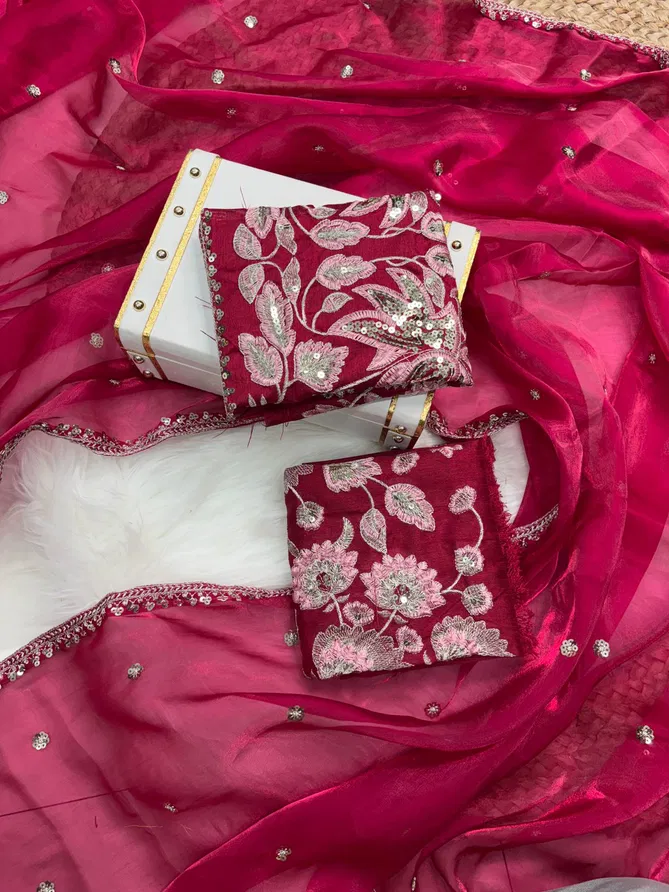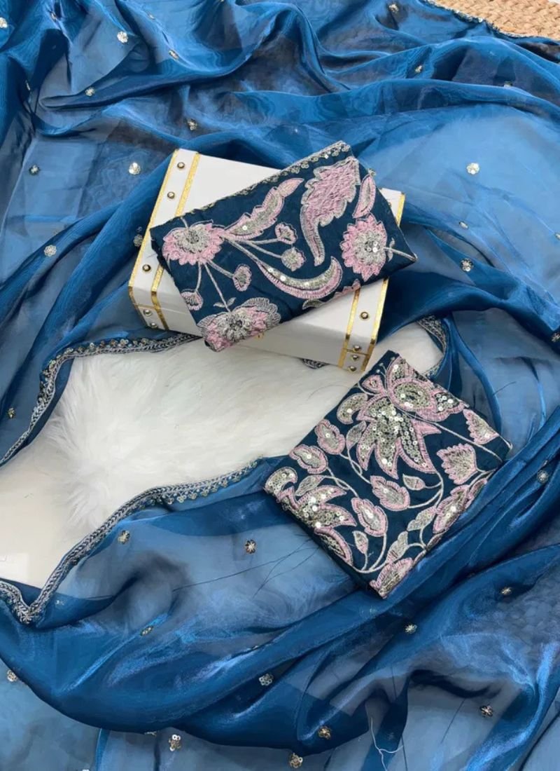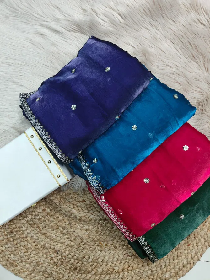 SAREES :Jimmy choo silk with 3mm sequence embroidery work lace border with all over sequence work buti | Blouse:-Mono banglory silk with designer fully embroidered work unstitch blouse | Length:-5.50MTR sarees and 0.80 blouse | (Single Available – 100 Rs. Per Pcs Extra for Singles)