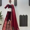 FabricLEHENGA DETAIL :-(FULL-STICHED) FABRIC : Velvet, WORK : Heavy Cording Sequence Embroidery Work Canvas with Cancan And piping, Inner : Micro, Up to 44” Size (LENGTH : 42”) | CHOLI DETAIL :-(UNSTICHED ) FABRIC : Velvet , WORK : Sequance Embroidery Work Front and Back side work comes Border Latkan Lace Work | DUPATTA DETAIL – Georgette Dupatta (2.5mtr) Sequence Embroidery Lace Work