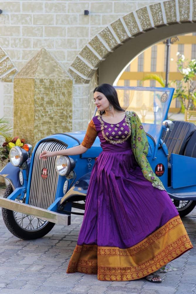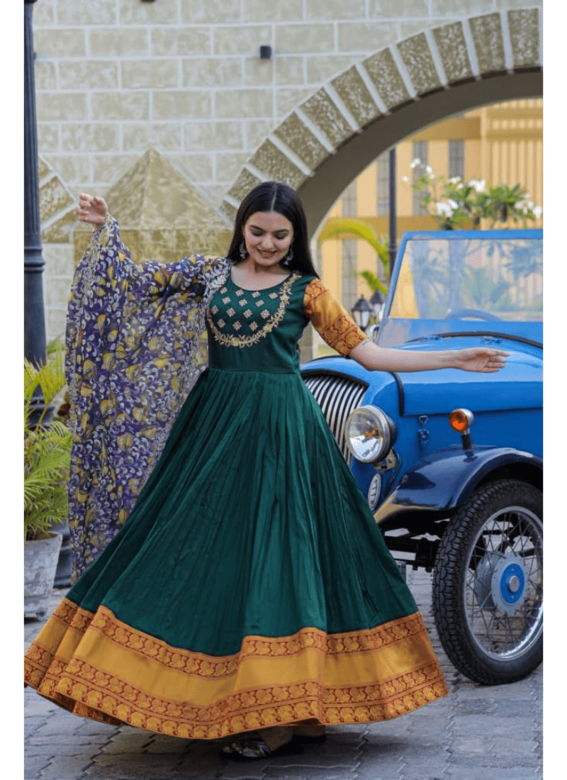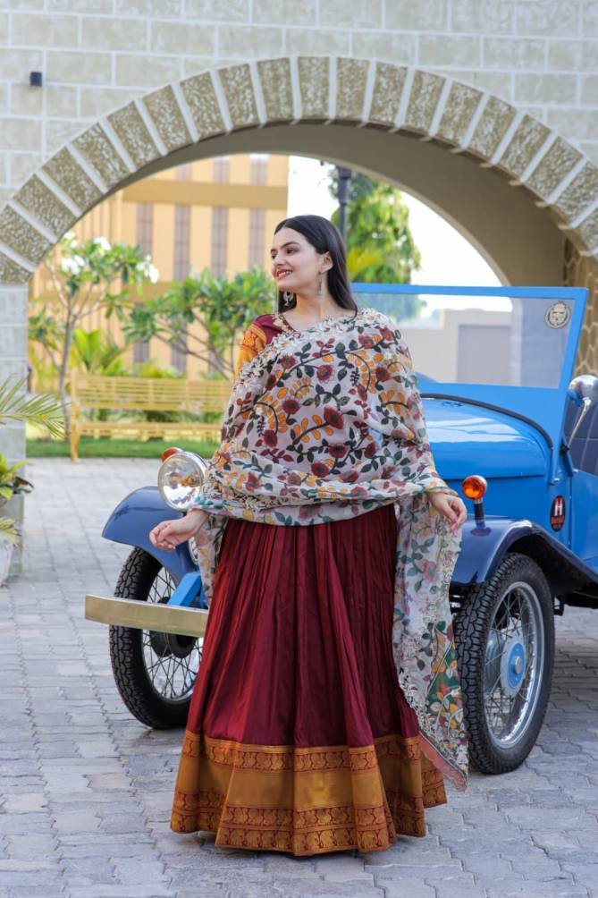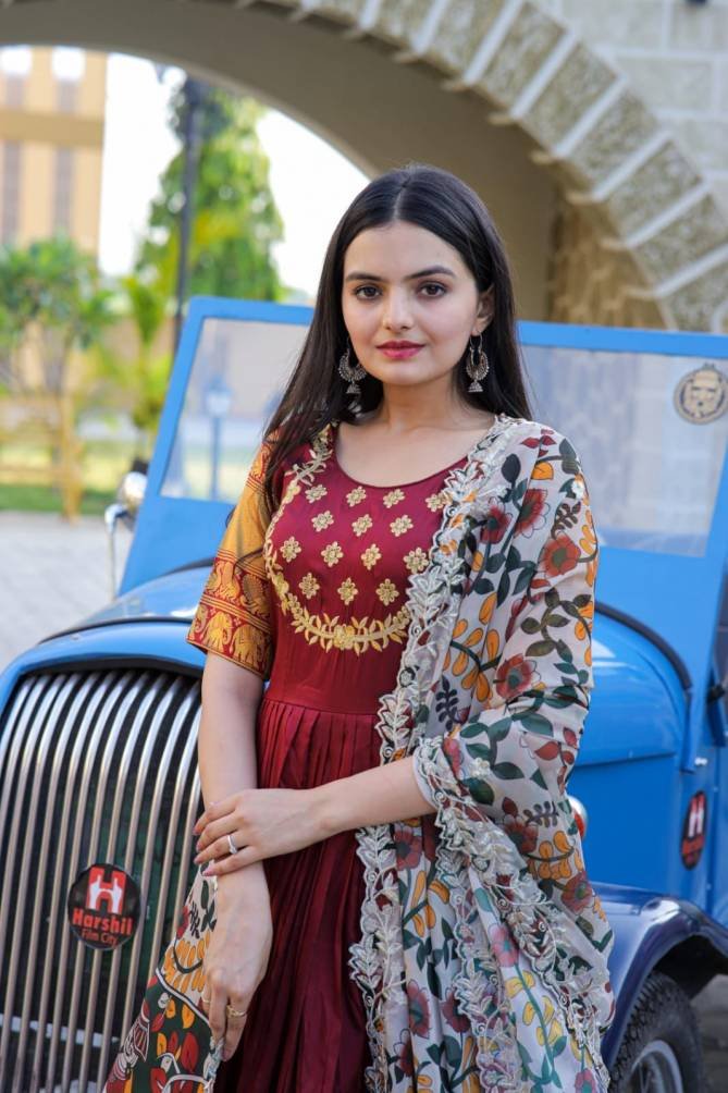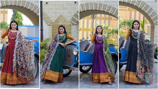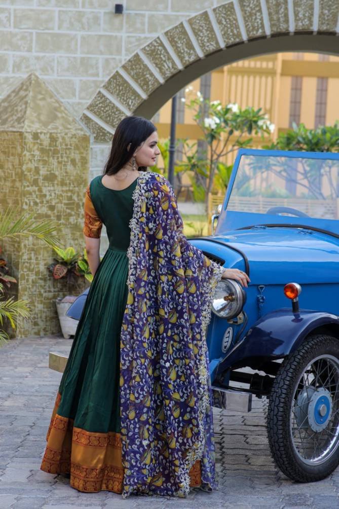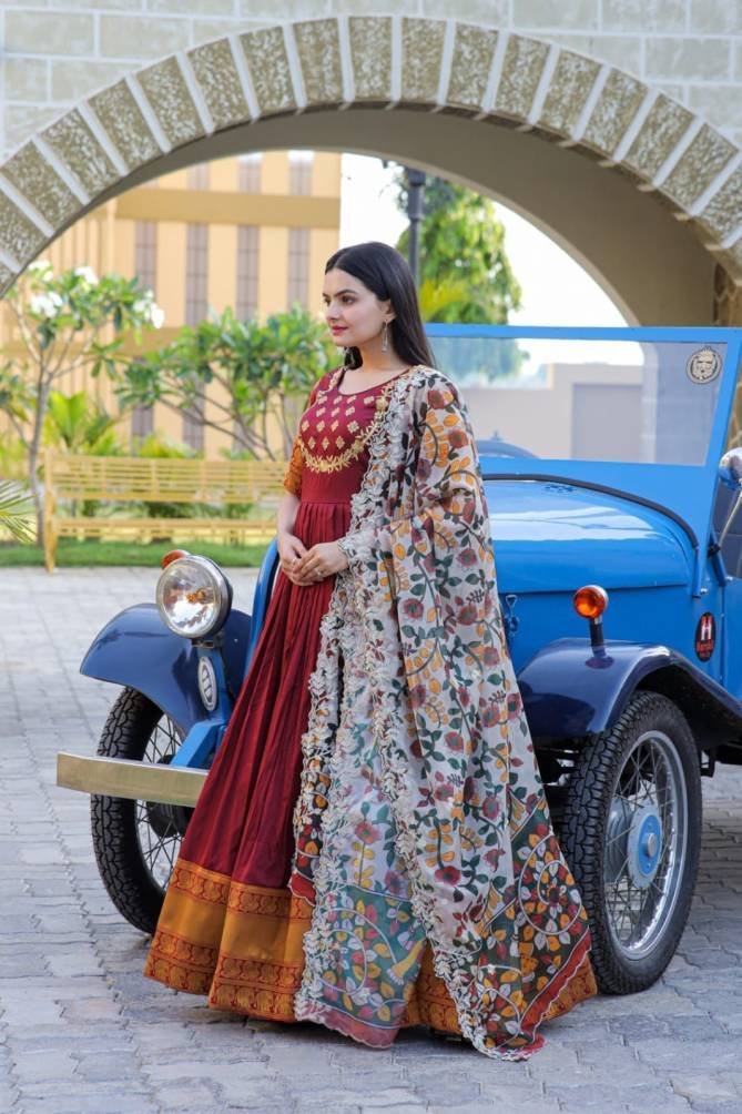 Fabric & Work: Silk With Jequard Weaving and Embroidered | Lining: Cotton Full Inner Top To Bottom | Length: 56″ | Flair: 3.5 MTR | Dupatta: Tebby Silk With Kalamkari Rich Print with Embroidered Cut Work | Length: 2.3 MTR