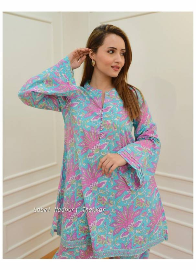 FabricCotton Super Dying | Work – printed and neckline border pompom buttons | length- 34approx | BOTTOM Fabric- Cotton | length-38