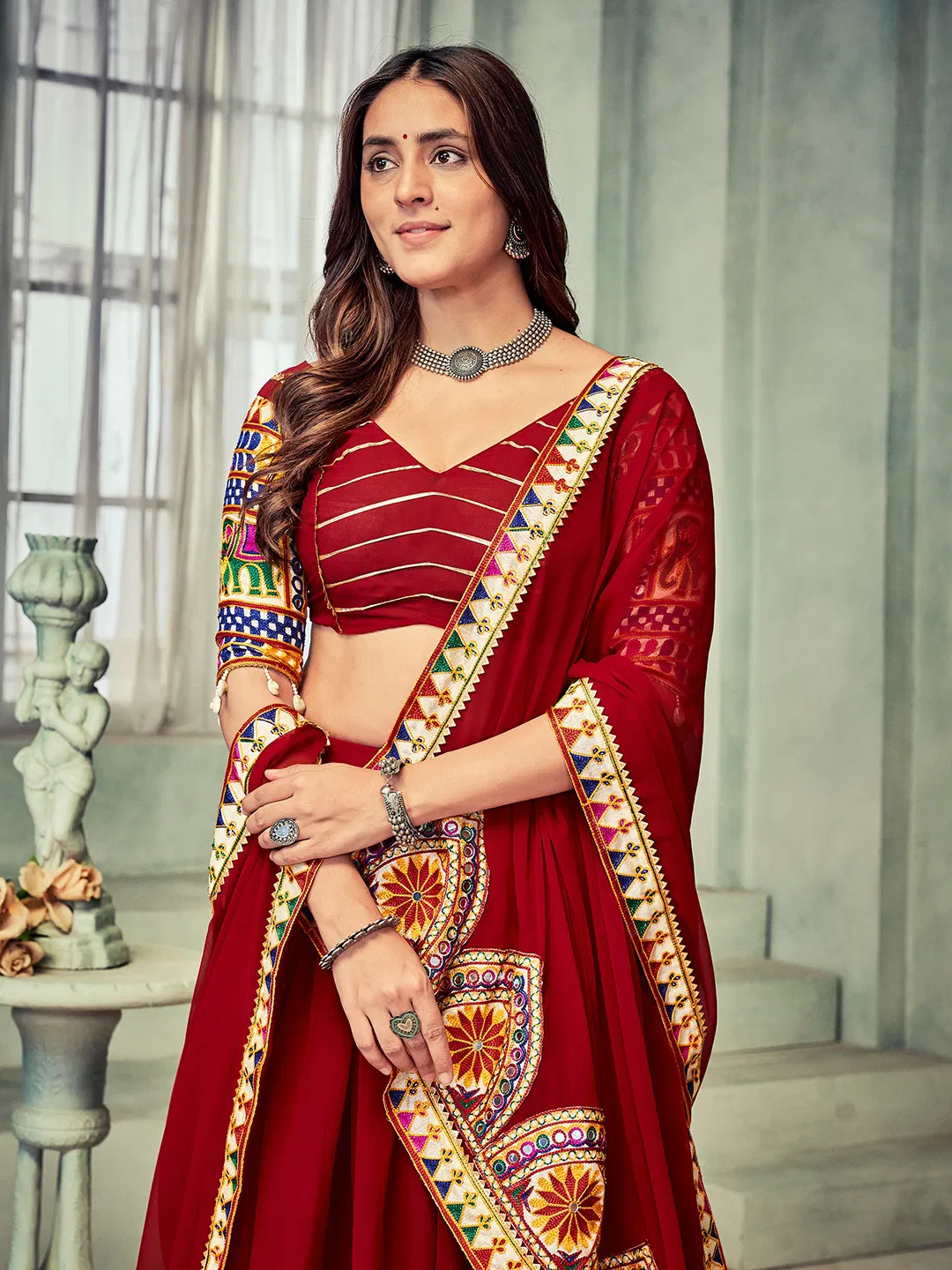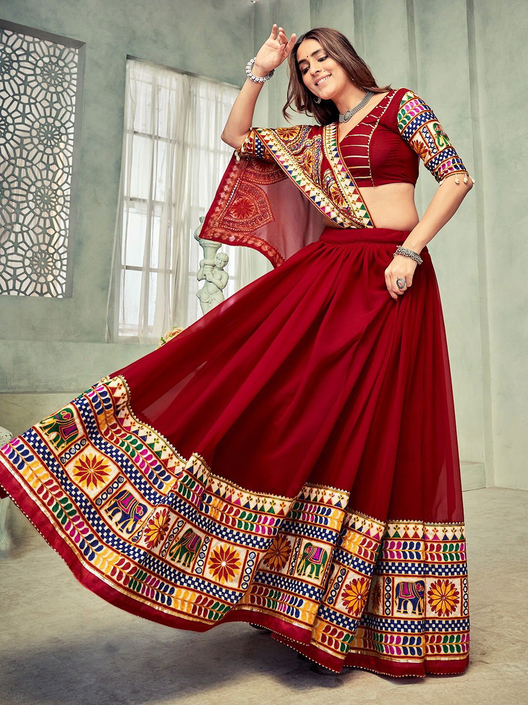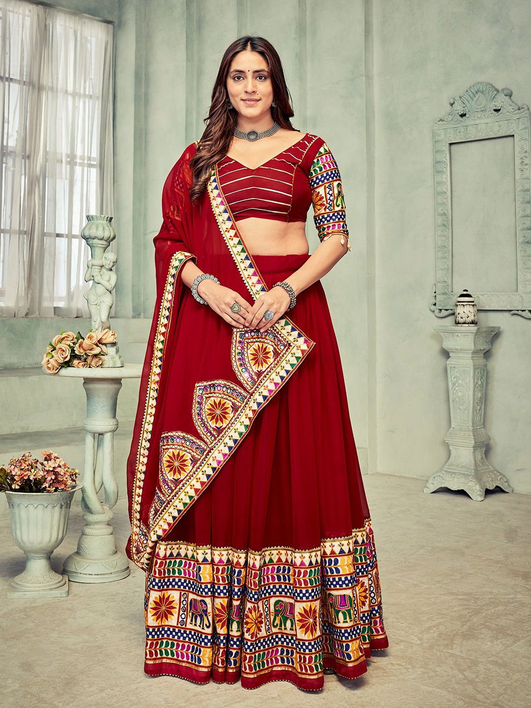 FabricLehenga Fabric : Georgette (Stitched) | Lehenga Work : Embroidery Work & Mirror Work | Lehenga Waist : Supported Up To 42 | Length : 42 | Flair : 5 Meter, Inner : Crepe | Blouse(Unstitched) Blouse Fabric : Georgette With Embroidery Work Blouse Length : 1 Meter | Dupatta Fabric : Georgette ( 2.2 Meter) With Embroidery Work