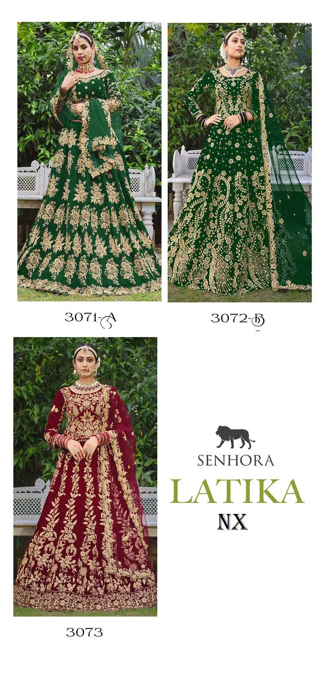 Lehenga : 9000 Heavy Velvet (Work : Fancy Dori Work With Stone Work ),( Size : Up to 44″) | Blouse : 9000 Heavy Velvet ( Work : Codding Embroidery Work & Stone Work ) (Size : 46+ ) | Dupatta : Net With 4 Side Embroidery Work And Latkans | Price For : 3071A :- 5047/- , 3072B :- 5047/- , 3073 :-4647/- |