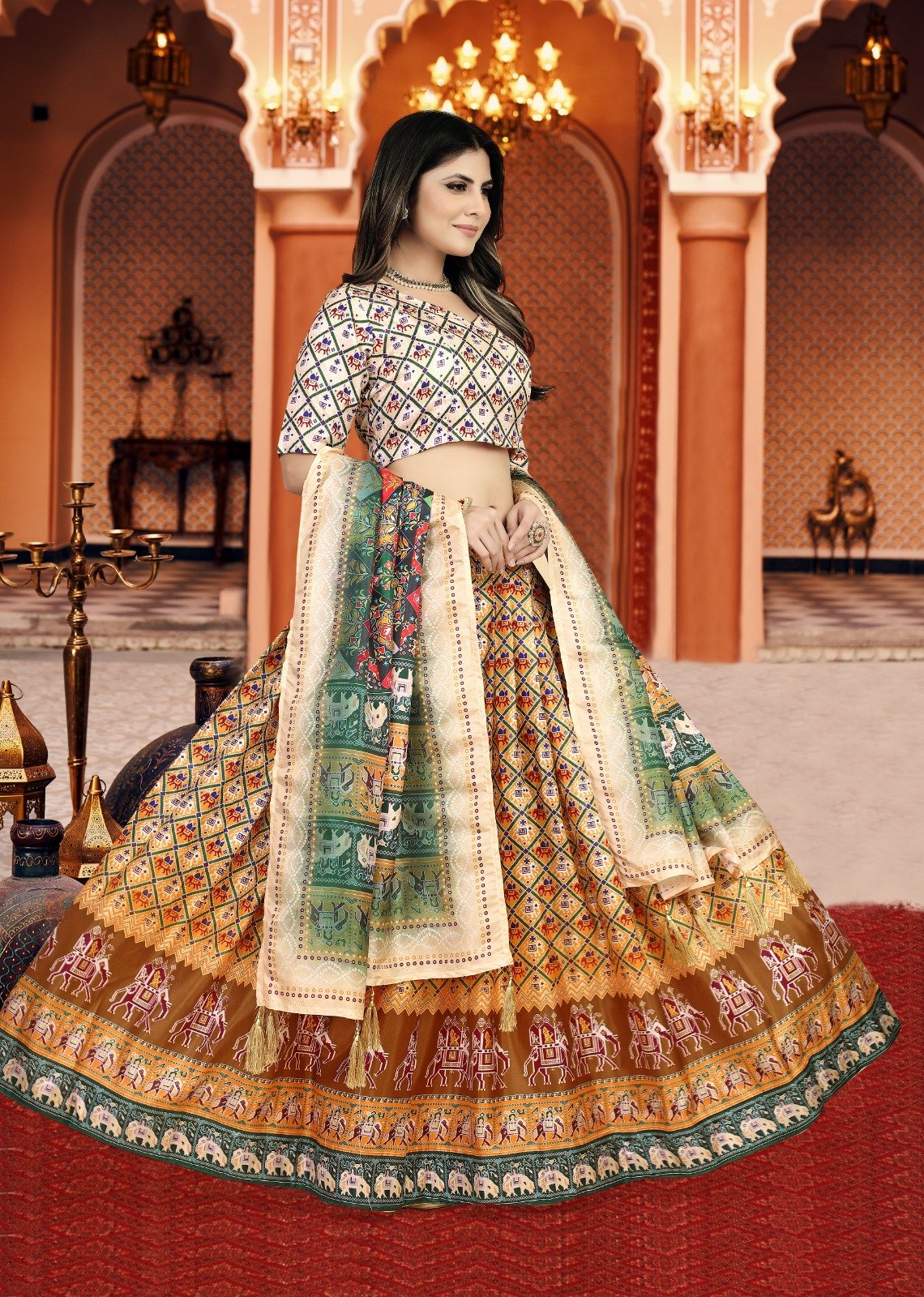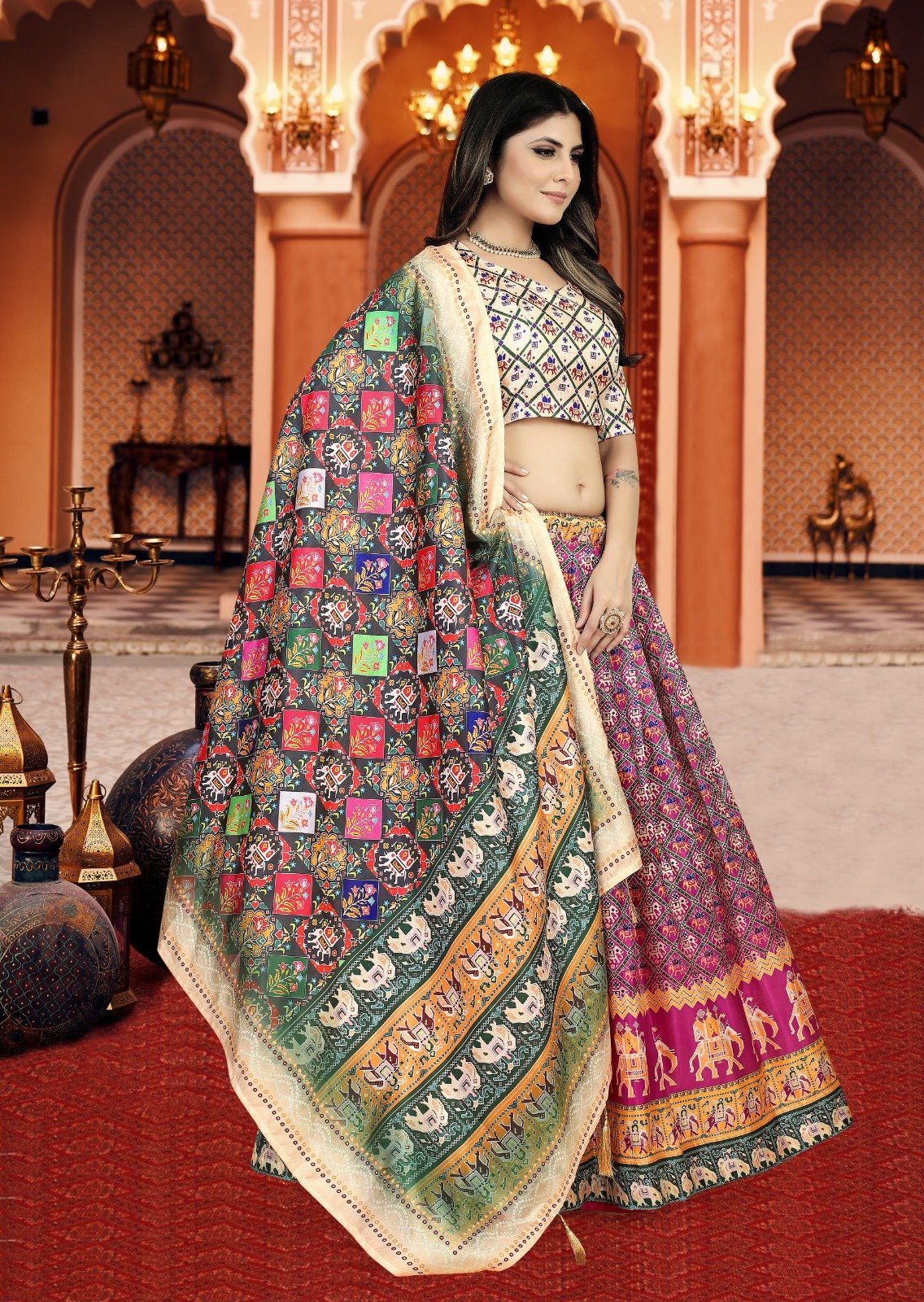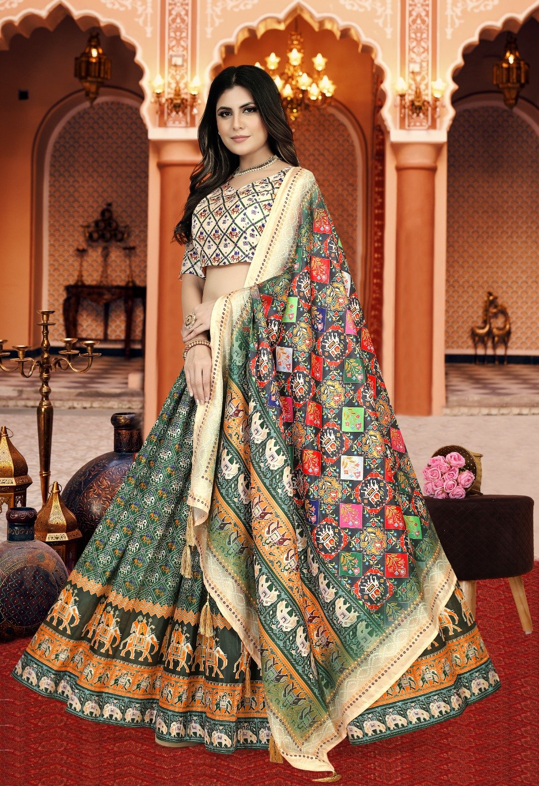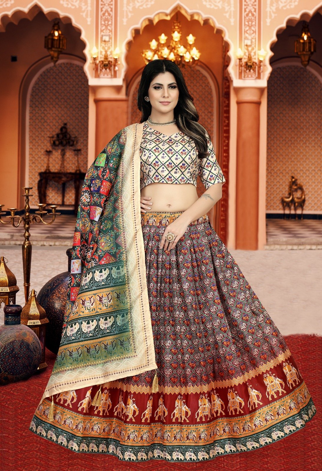 FabricLehnga : ( Semi Stitch ) | Fabric : Dola Silk | emblishment : Digital Print Work | Flair : 5.00Mtr | Inner : heavy Crepe | Size : Customize Up To XS(34) To 4XL(48) | Height : 42″ | Blouse : 1 Mtr Unstitched | Fabric : Dola Silk | Dupatta Fabric : Dola Silk | Emblishment : Digitol Print work With Tassels | Length : 2.5 Mtr |