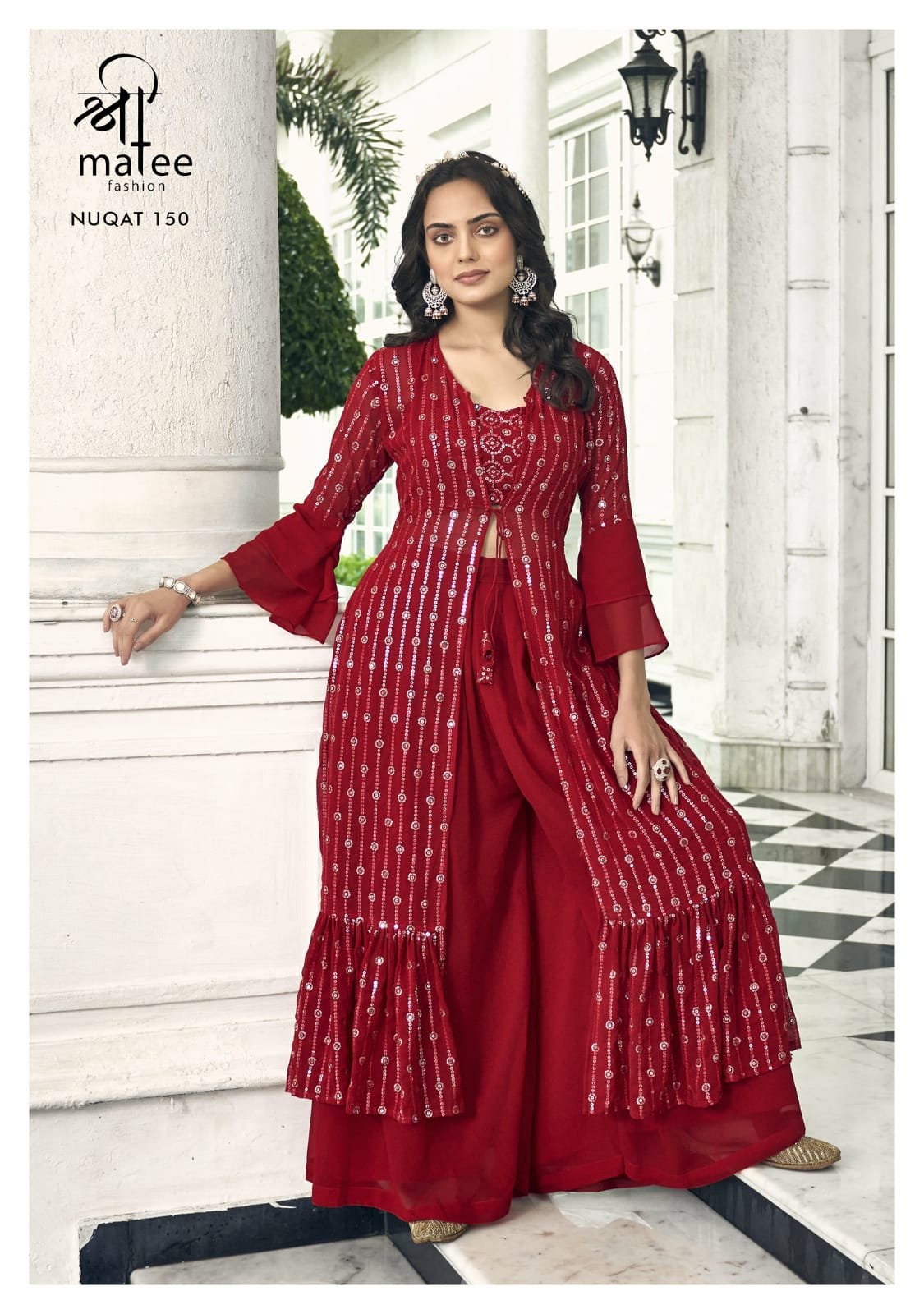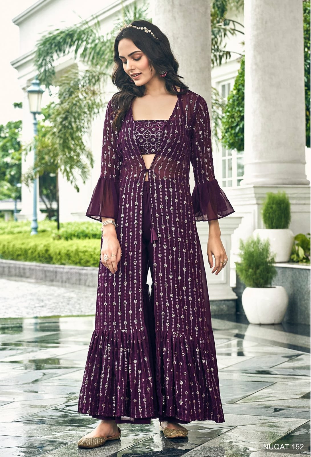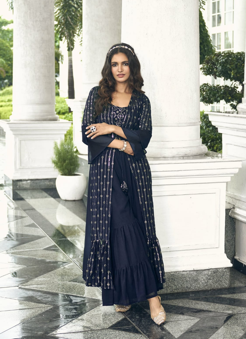 FabricBLOUSE : Pure Fox Georgette with Embroidery Work. (Free size stitch-44), SHARARA & PLAZO -* Pure Fox Georgette. (Full Stitched), JACKET-* Pure Fox Georgette with Embroidery Work (52 Inches Length)