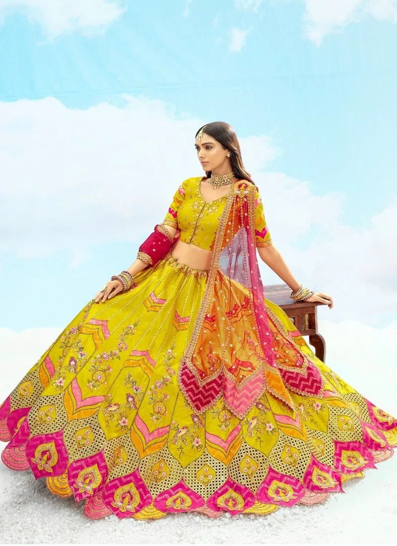 FabricLehenga Fabric : Fancy Silk With Cut Work Border ,Stone,Sequence With Embroidery Weaving Butti Work All Over Lehenga | Blouse: Silk With Embroidery Work | Dupatta : Georgette With Weaving Butti Work Border | 7601-7602-7611 Net Dupatta With Designer Cutwork Border | Pls Note : 7607 Stock Out | (Single Available – 500 Rs. Per Pcs Extra for Singles- based on price list below)