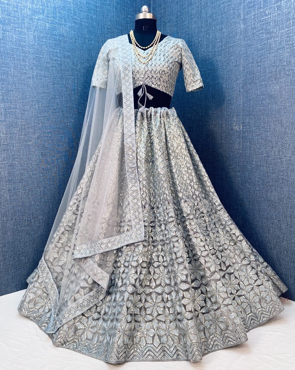 Lehengha Fabric: Net, Dupatta Fabric: Net, Blouse Fabric – Net with Embroidered work & Sleeves, Inner – Micro attached, Set type: Lehenga Choli And Dupatta, Print or Pattern Type: Heavy Multi Embroidered with Sequence Work and Four side Lace Dupatta Sizes: Free Size (Lehenga Waist Size: 44 in, Lehenga Length Size: 43 in, Duppatta Length Size: 2.20 m)