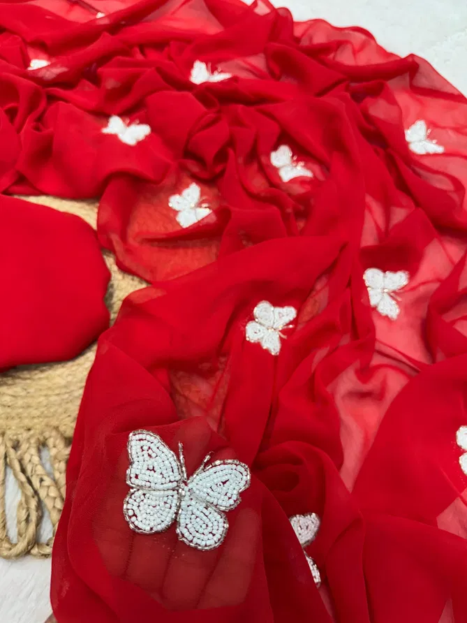 RICH BEADS MOTI BEADS HANDWORK BUTTERFLY | WORK WITH SOFT GEORGETTE DARK COLOR PRETTY | RANGE FOUR COLOR WITH RUNNING BLOUSE | CUT 6.30 MTR | (Single Available – 100 Rs. Per Pcs Extra for Singles)