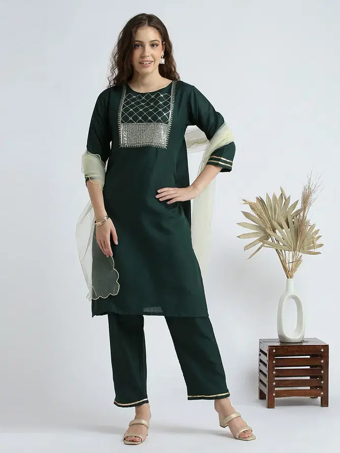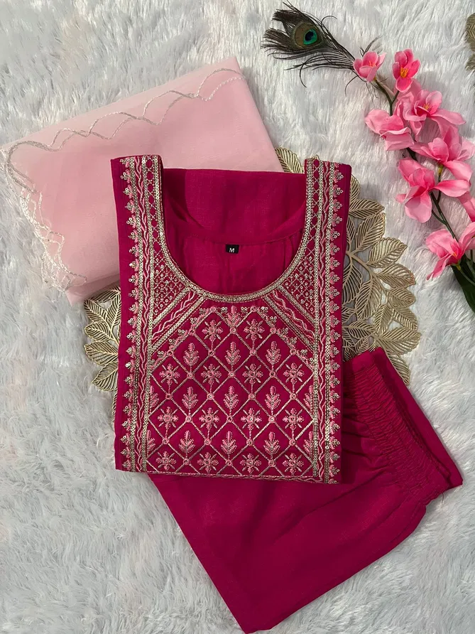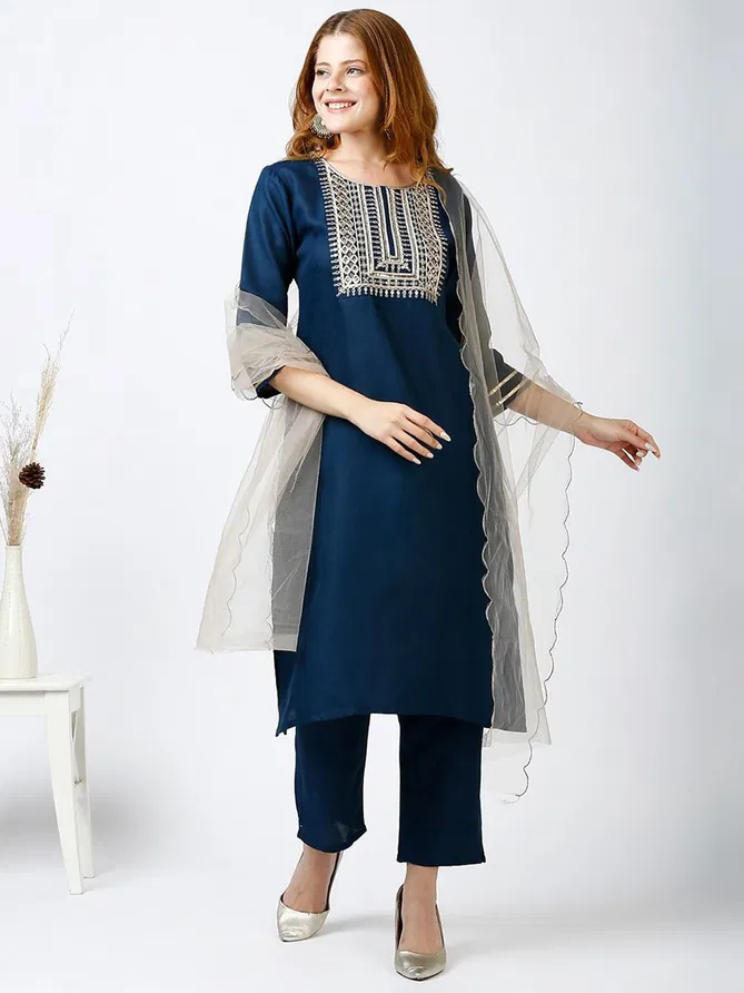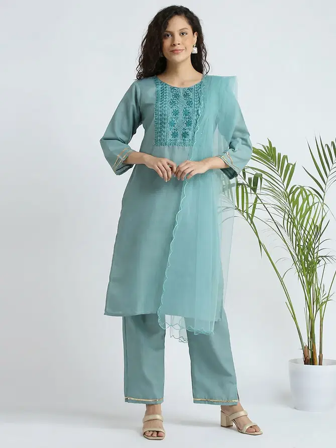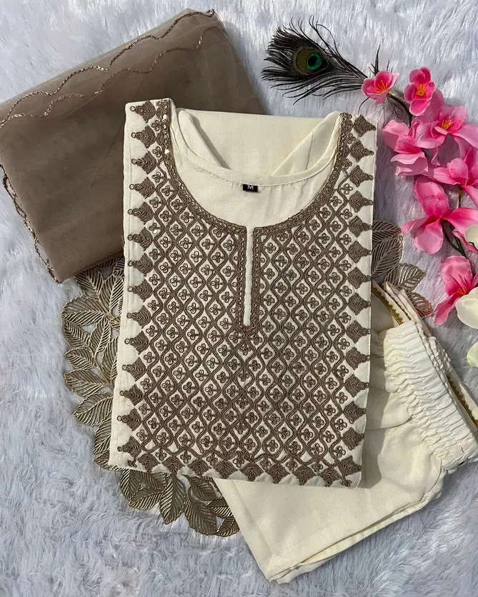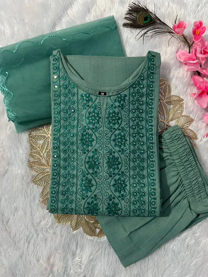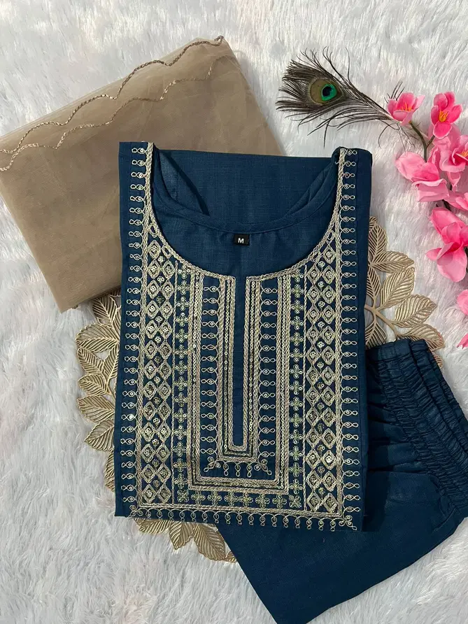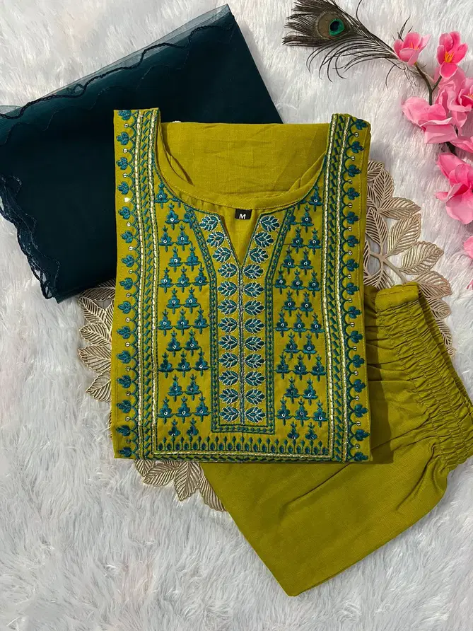 Kurti :- Slub Cotton With Embroidery, Sequence Work | Pent :- Slub Cotton | Dupatta :- Mono Net with Four Sided Aari Work (2.10 mtr) | (Single Available – 100 Rs. Per Pcs Extra for Singles)